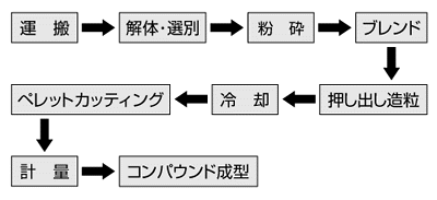 再生された塩ビコンパウンドは、同じ用途に戻される自動車の内装材やシュリンクフィルムを除き、大半は床材の原料としてリサイクルされます。また、輸液バッグは、家庭用のホースなどにも利用されています。