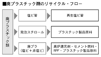 「できるだけきれいな塩ビ管だとか、塩ビの混入しないものといった厳しすぎる受け入れ基準が廃プラスチック類のリサイクルのネックになっている。多少の汚れや塩ビの混入も認めてくれるような受け入れ側の対応がリサイクル率を上げることにつながる」