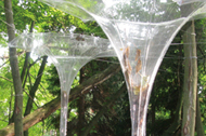 作品を制作したのは、グループのメンバーで東京芸術大学美術学部4年生の小林美穂さん。タイトルは「artificial filter」。透明なロート型の塩ビのオブジェが、周囲の自然の変化をフィルターのように吸収して漉しとっていく−そんな「濾過」「循環」といったイメージを表現した作品で、木立の間に配置された25個のオブジェが夏の光を受けてきらめく眺めは、まるで人工のフィルターが生々しい命を得たような不思議な浮遊感を漂わせています。